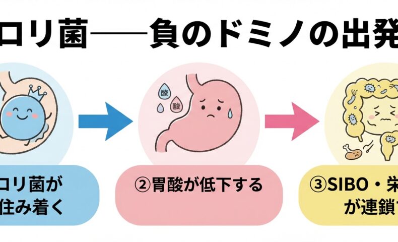 ピロリ菌 → 胃酸低下 → 殺菌バリア破綻 → SIBO(小腸での細菌増殖) → 栄養吸収低下 → 鉄・B12不足・慢性疲労 → 腸カンジダ・リーキーガット